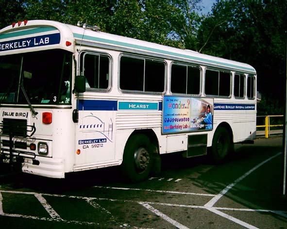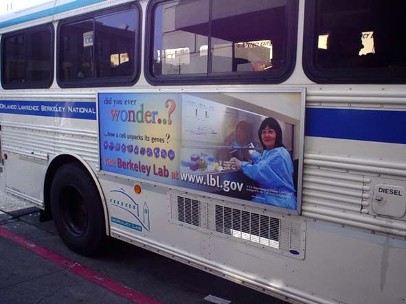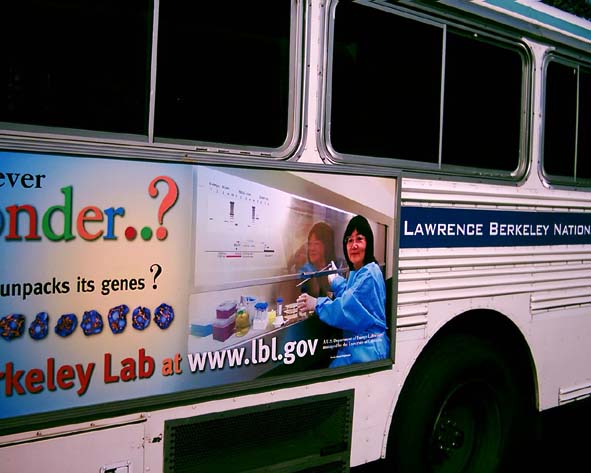 さて、私供が、今所属しているLawrence Berkeley Laboratory では、内部の研究成果を、地域の人々に紹介する奇抜な方法を実践しています。米国内でも他に例がありません。それは、生物や物理で、面白そうな成果を出した研究を選んで、その研究に携わった人の写真を、大きく拡大して、構内バスと外回りのバスの側面にはって校内と市内を走るのです。これらのバスは10分間隔に走っています。3か月間ごとに、新しい研究/写真と入れ替わります。この目的は、町の人たち、中でも特に中高校生に、サイエンスに興味を持ってもらえるよう企画したと聞きました。