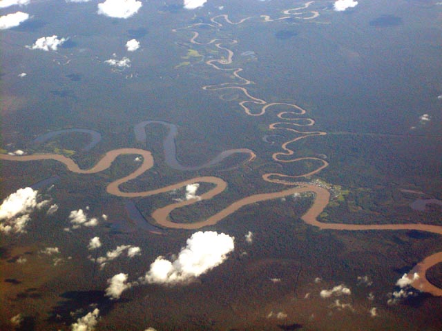 3枚目はボルネオの大地を流れる川です。大陸といっても良いくらいに 大きな島なので、川も大陸河川の如く、三日月湖を作ったりして、 蛇行しています。